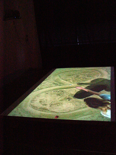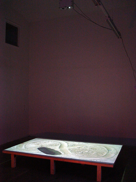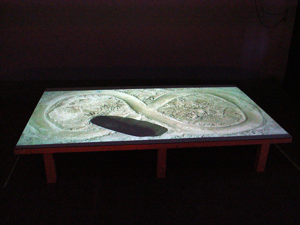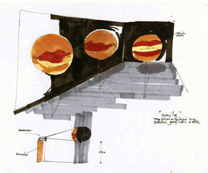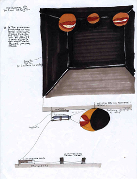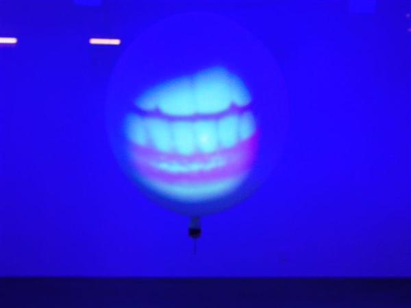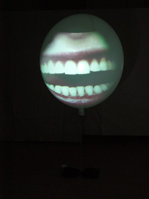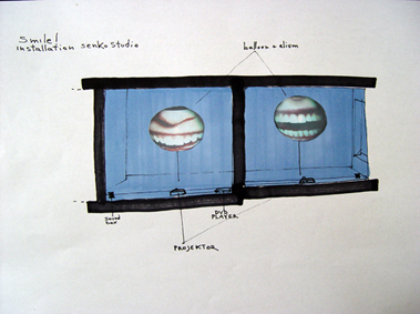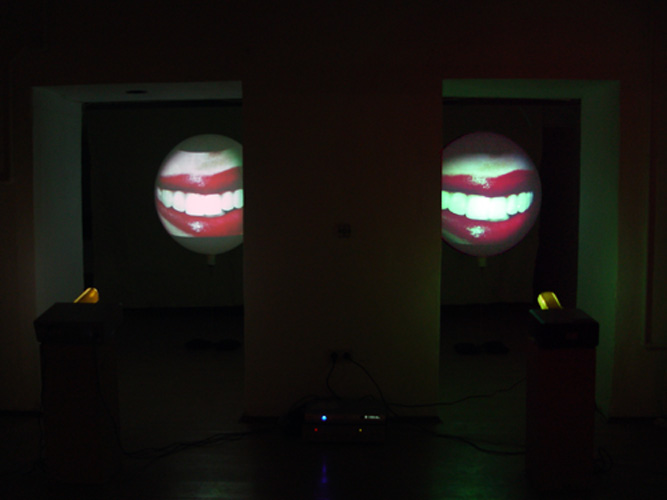 On a horizontal platform we see a video projection in which two persons are facing each other, playing with small balls in the sand, as kids used to on Italian beaches, (the video was done inviting artists and curators to join the game). Next to the platform an automat is placed from wich the balls can be pulled. In place of the otherwise usual pictures of sportsmen inside the balls, such as racing cyclists or autopilots of the formula 1, the "champions" of the world of art, such as Cattelan, Beecroft etc. are represented. The room is filled with the rumbling of the engines of racedriving cars.Smile!